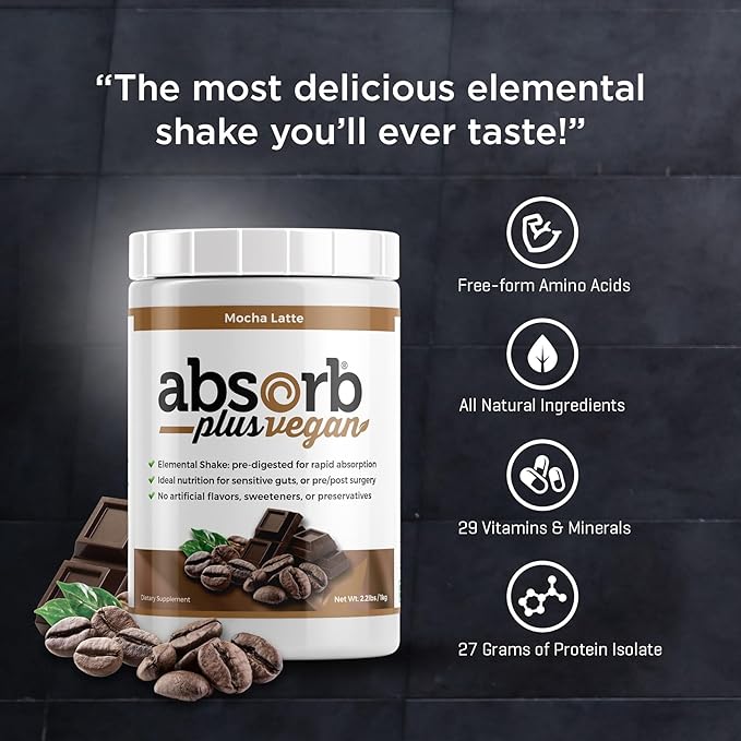 Absorb Plus is a delicious tasting, 100% natural, semi-elemental (pre-digested for maximum absorption to bloodstream within 20 minutes of ingestion) polymeric liquid dietary supplement protein shake.